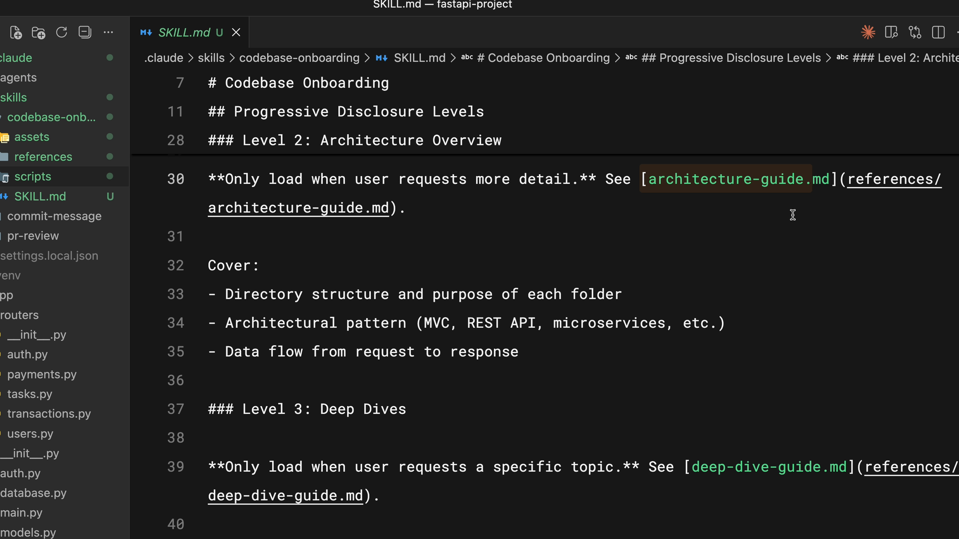 점진적 공개가 이 문제를 해결합니다. 필수 지침은 SKILL.md에 유지하고 세부 참조 자료는 Claude가 필요할 때만 읽는 별도 파일에 넣으세요.