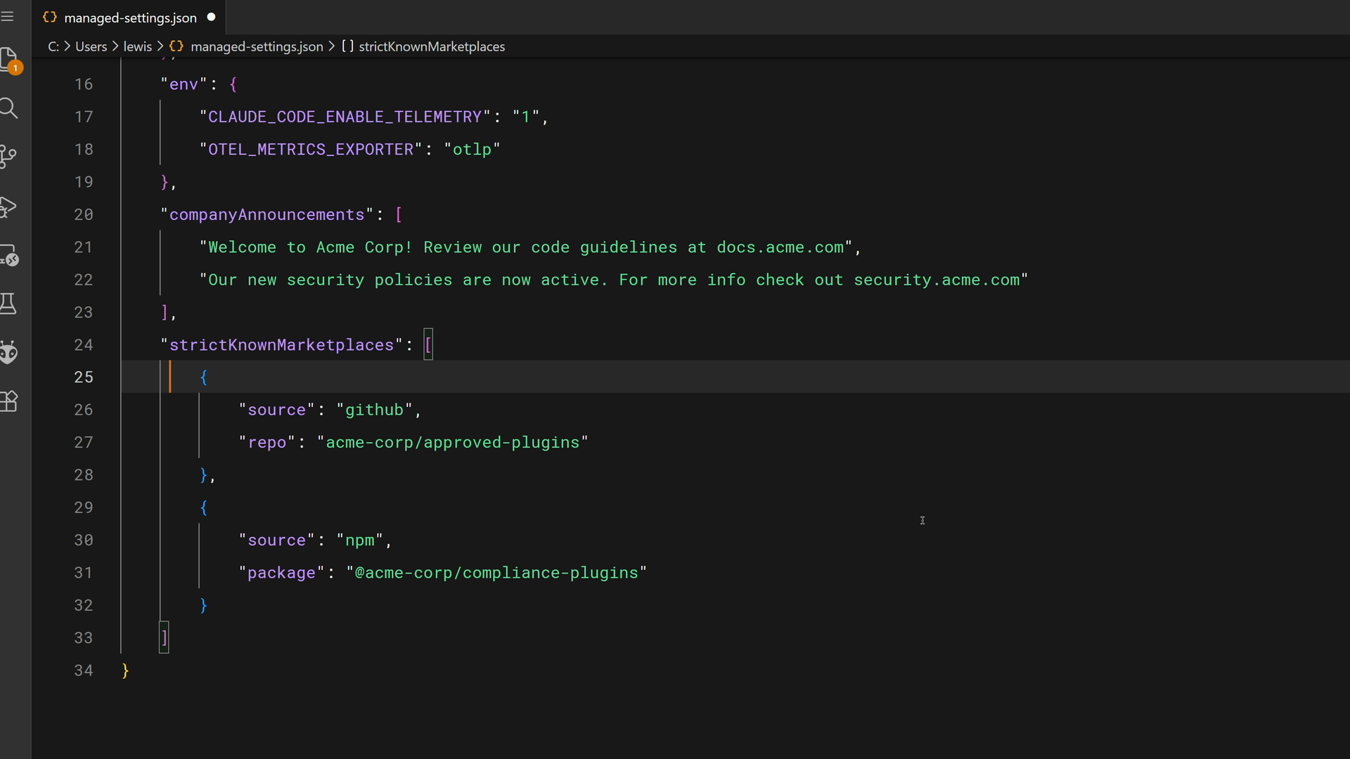 관리 설정 파일은 플러그인 설치 출처를 제어하기 위한 strictKnownMarketplaces와 같은 기능을 지원합니다:
