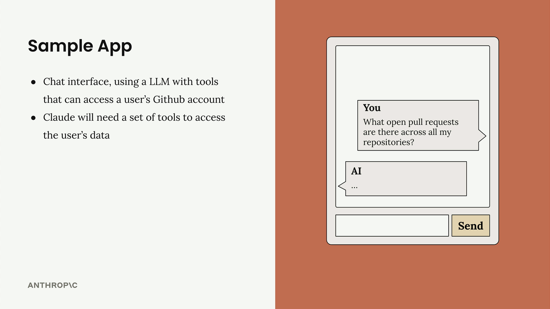 사용자가 Claude에게 GitHub 데이터에 대해 질문할 수 있는 채팅 인터페이스를 구축한다고 가정해 봅시다. 사용자가 "내 모든 리포지토리에 열려 있는 풀 리퀘스트는 무엇인가요?"라고 물을 수 있습니다. 이를 처리하려면 Claude가 GitHub API에 접근할 수 있는 도구가 필요합니다.