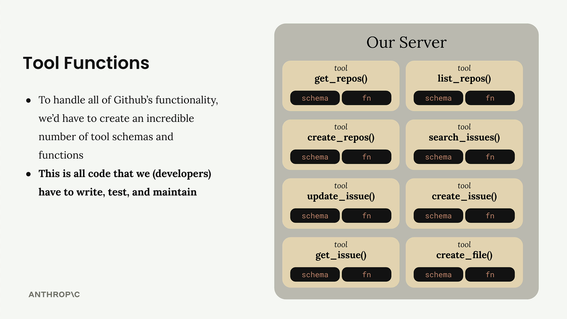 GitHub는 리포지토리, 풀 리퀘스트, 이슈, 프로젝트 등 방대한 기능을 가지고 있습니다. MCP 없이는 GitHub의 모든 기능을 처리하기 위해 엄청난 수의 도구 스키마와 함수를 만들어야 합니다.