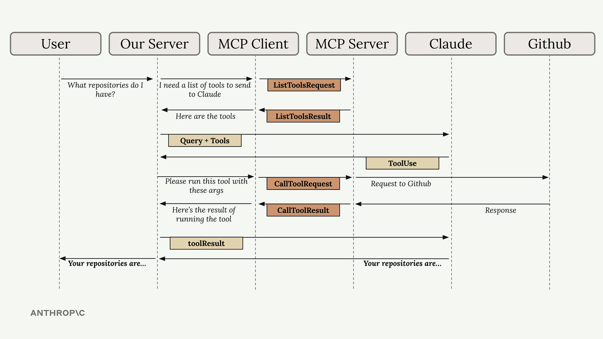 사용자 쿼리가 전체 시스템을 통해 흐르는 완전한 예제를 보여드립니다 - 여러분의 서버에서 MCP 클라이언트를 거쳐 GitHub 같은 외부 서비스로, 그리고 다시 Claude로 돌아옵니다.