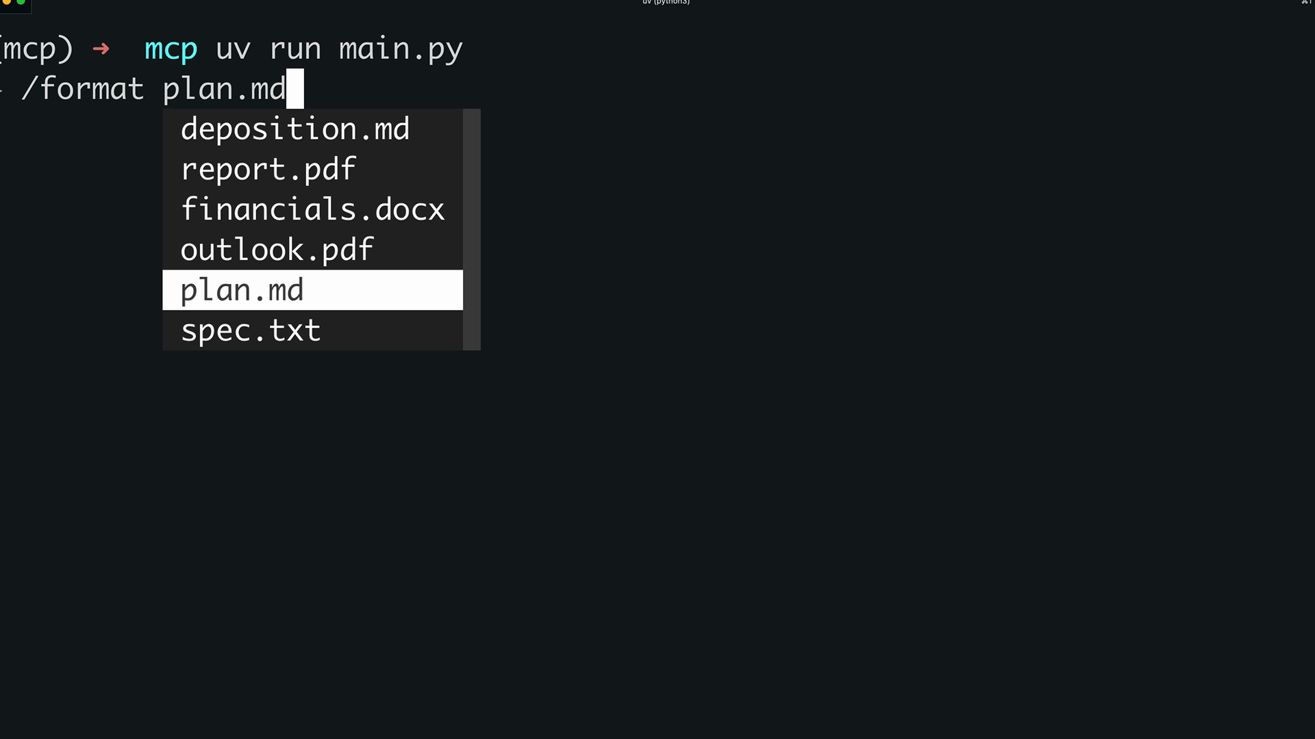 구현이 완료되면 CLI를 통해 프롬프트를 테스트할 수 있습니다. 슬래시(/)를 입력하면 사용 가능한 프롬프트가 명령으로 표시됩니다. "format" 같은 프롬프트를 선택하면 사용 가능한 문서 중에서 선택하라는 메시지가 표시됩니다.