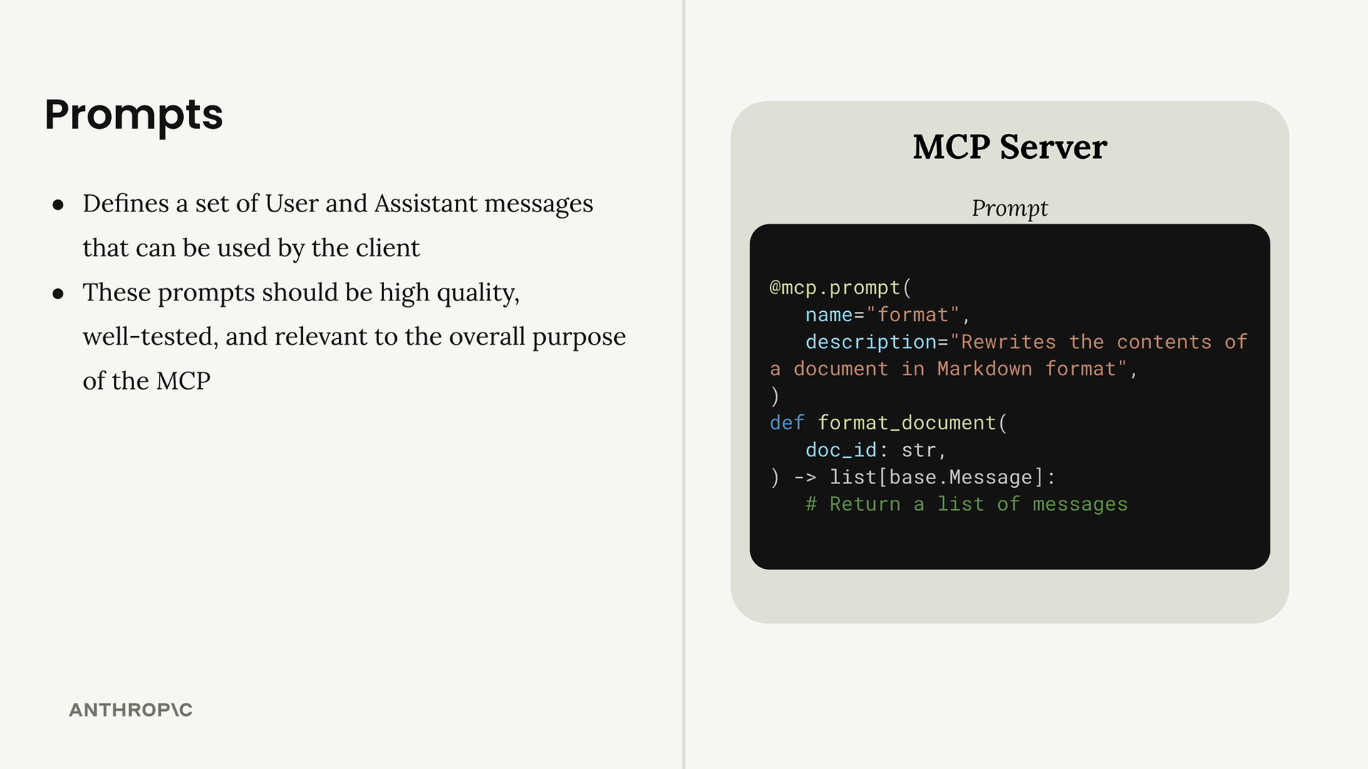예를 들어, 서버에 doc_id 매개변수를 기대하는 format_document 프롬프트가 있다면, 인자 딕셔너리에는 {"doc_id": "plan.md"}가 포함됩니다. 이 값은 프롬프트 템플릿에 보간됩니다.