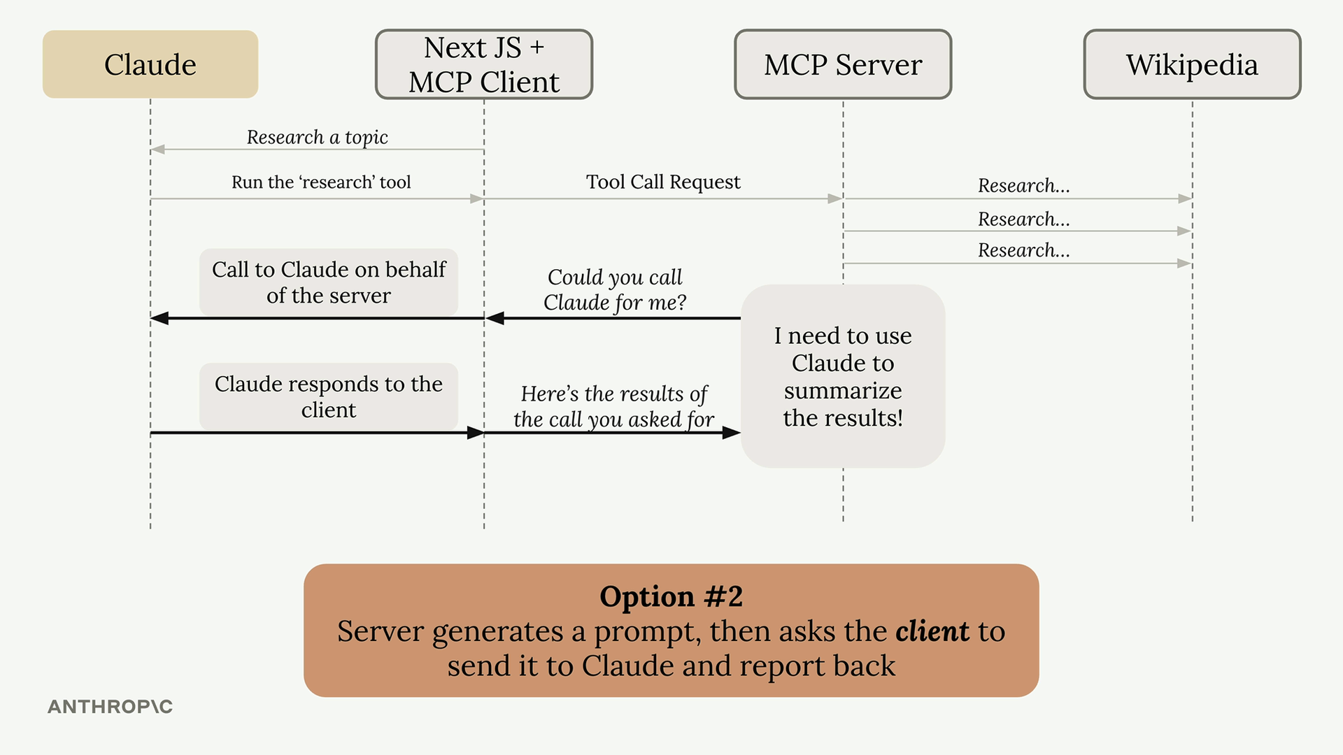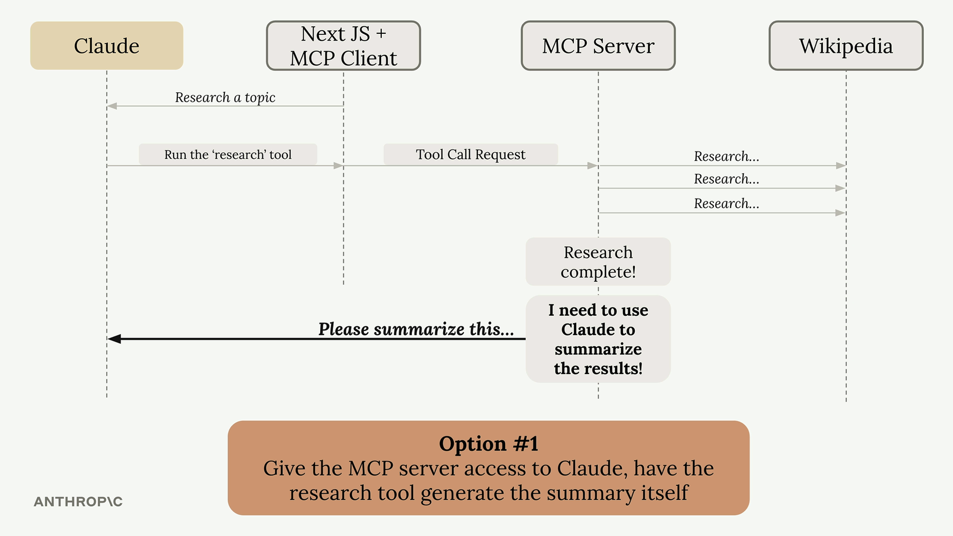 Wikipedia에서 정보를 가져오는 리서치 도구가 있는 MCP 서버가 있다고 가정해 봅시다. 모든 데이터를 수집한 후 이를 일관된 보고서로 요약해야 합니다. 두 가지 선택지가 있습니다: