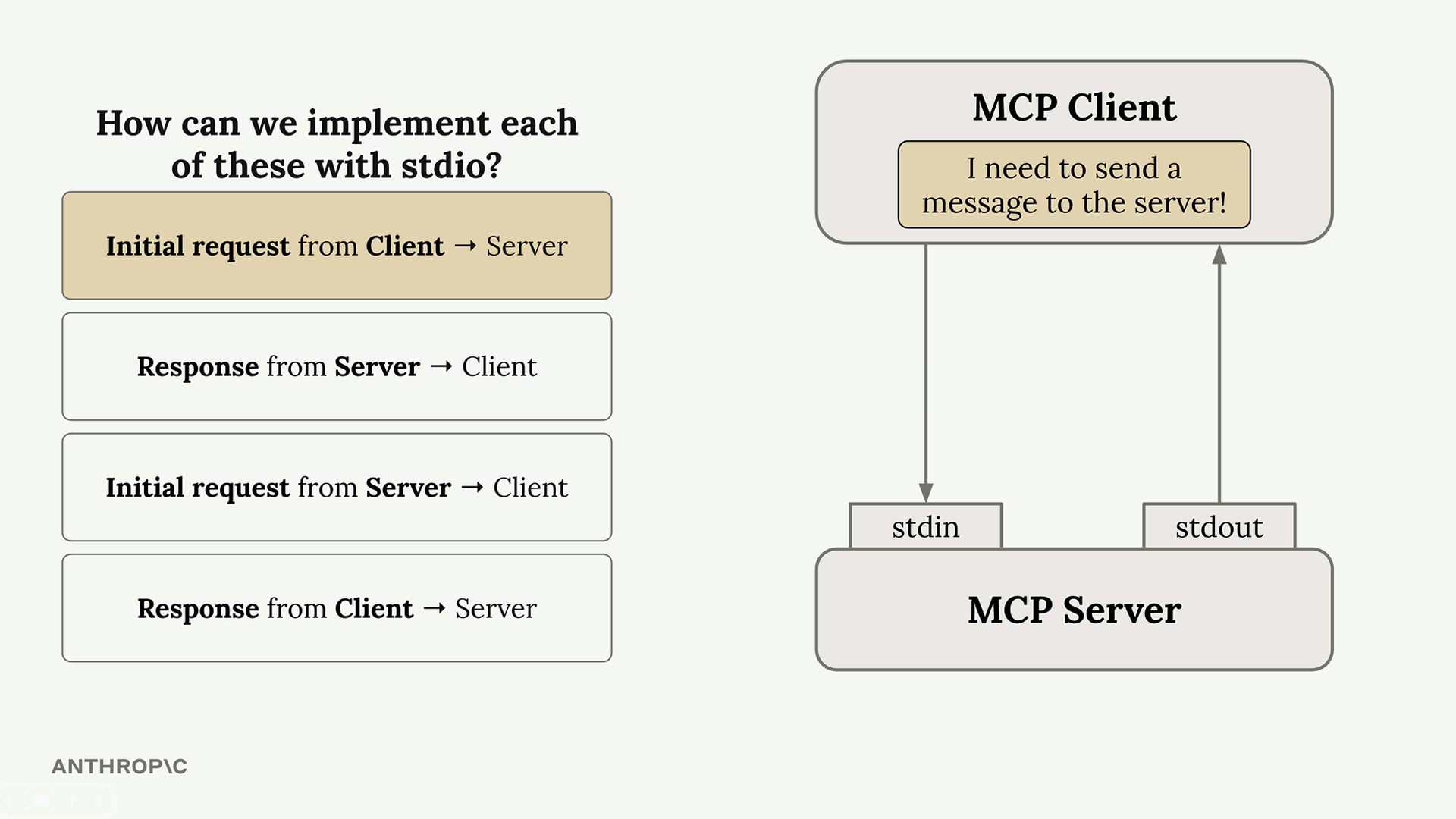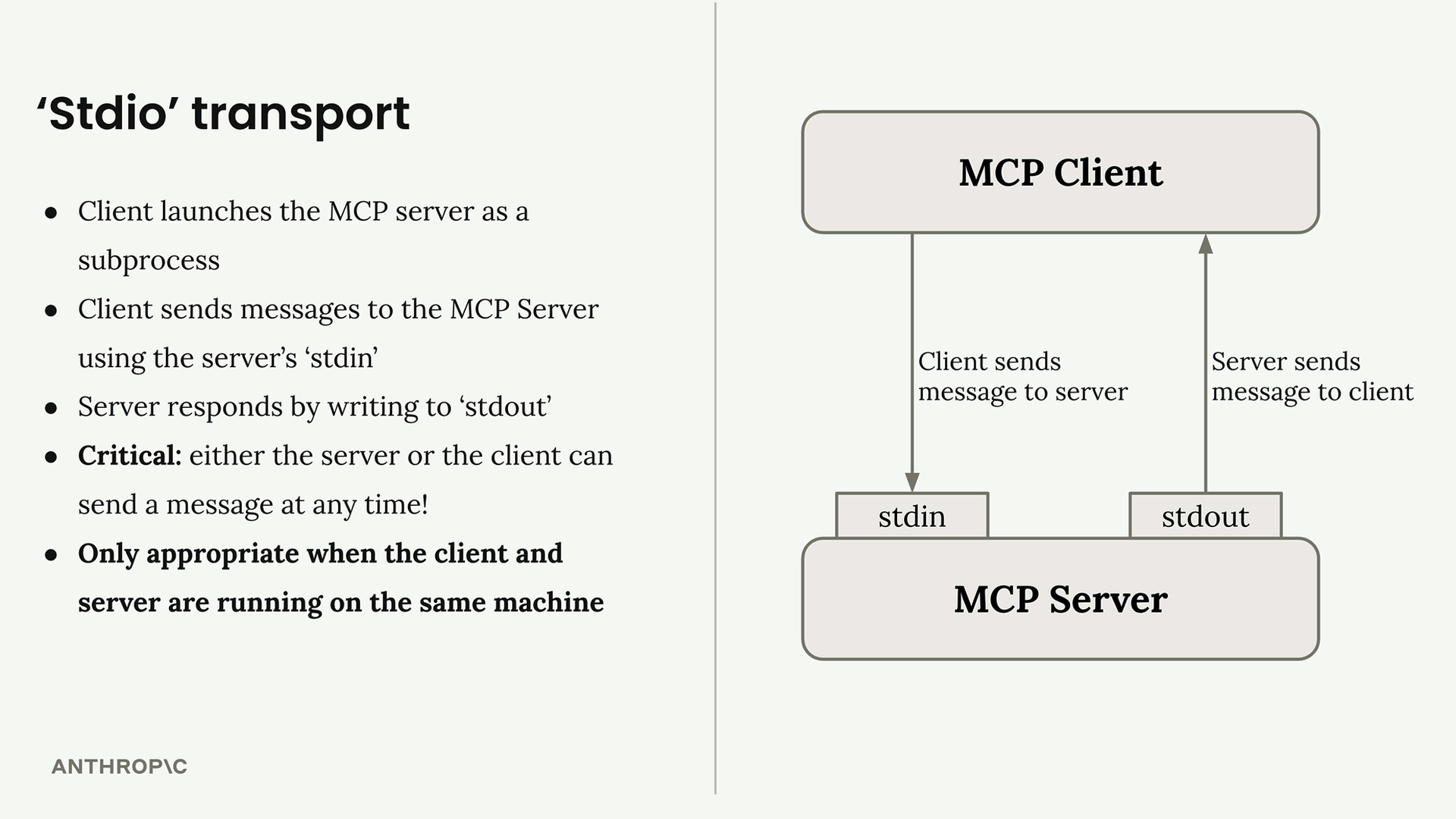 stdio 전송을 이해하는 것이 중요한 이유는 양방향 통신이 원활한 "이상적인" 경우를 나타내기 때문입니다. HTTP와 같은 다른 전송으로 이동하면 서버가 항상 클라이언트에 요청을 시작할 수 없는 제한을 만나게 됩니다. stdio 전송은 기준점에서 다른 전송의 절충안을 이해하는 데 도움이 됩니다.