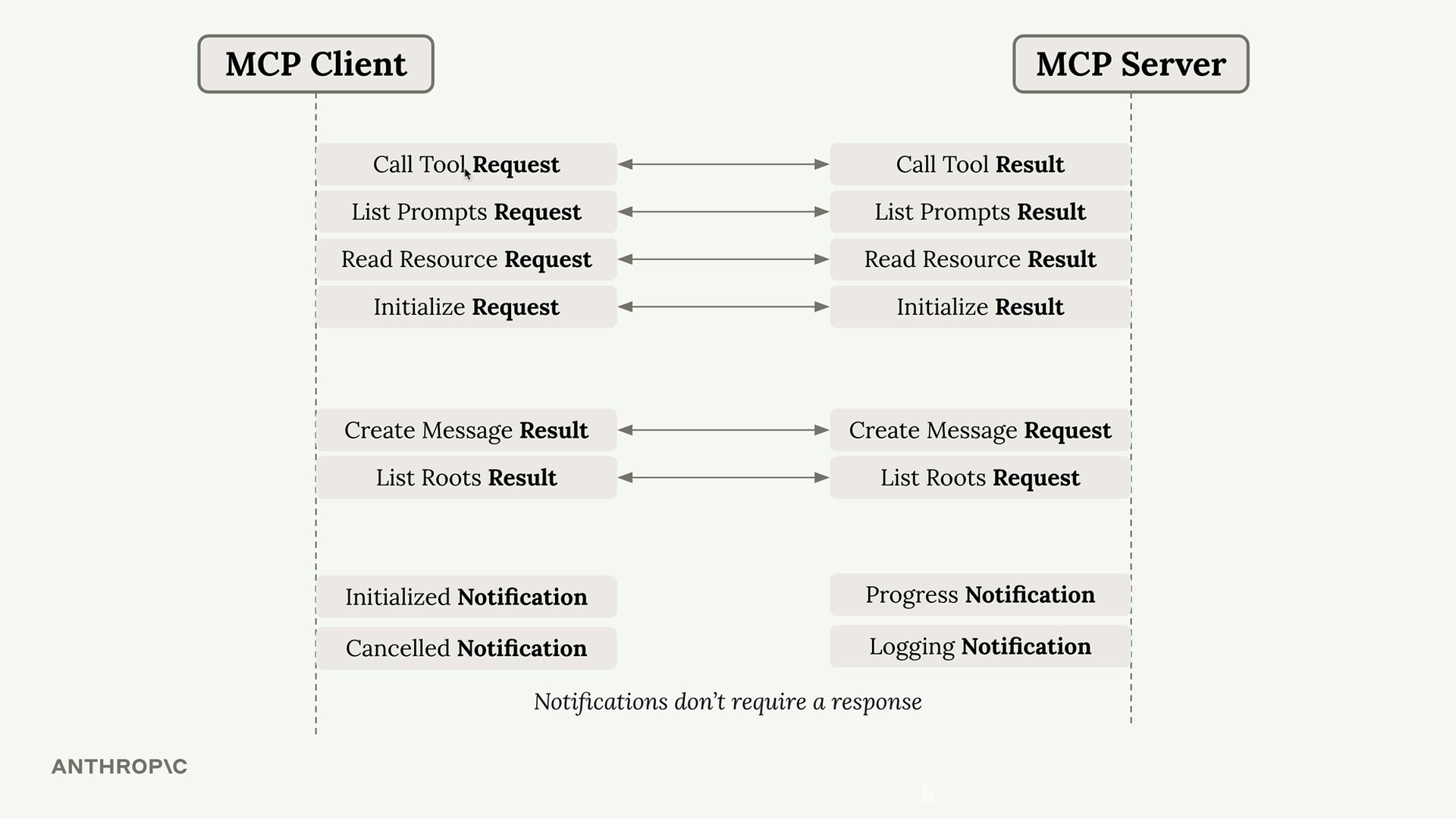 MCP는 양방향으로 흐르는 다양한 메시지 유형을 지원합니다: