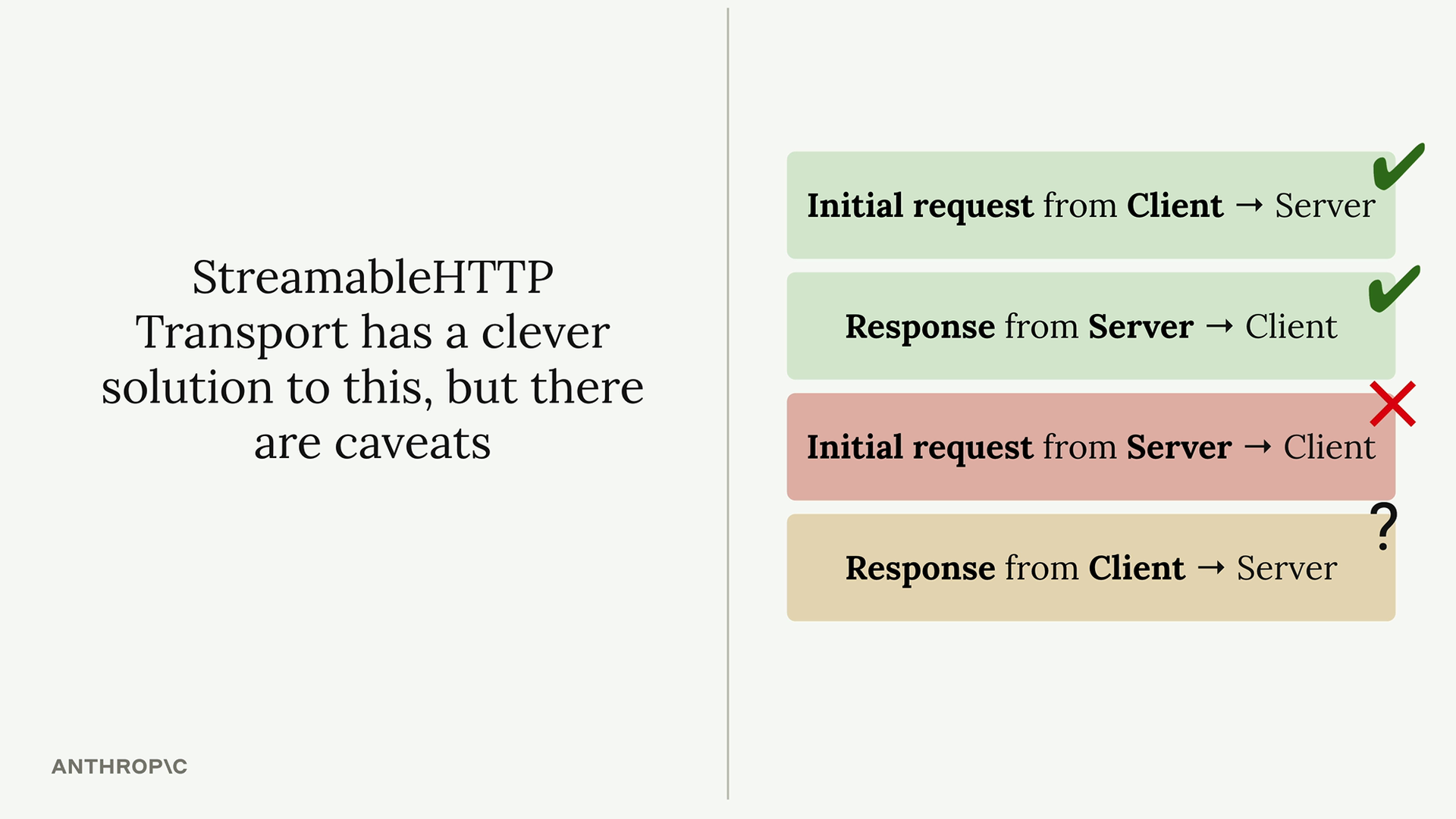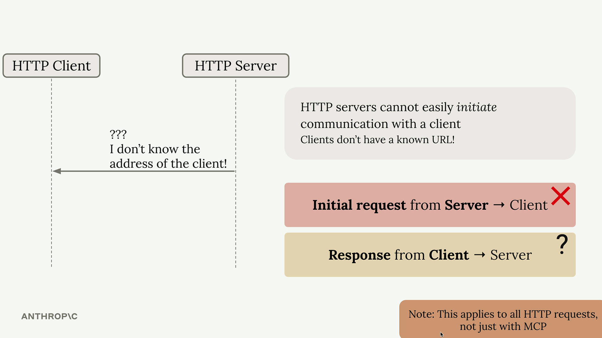 이 HTTP 제한은 특정 MCP 통신 패턴에 영향을 미칩니다. 다음 메시지 유형들은 일반 HTTP로는 구현하기 어려워집니다: