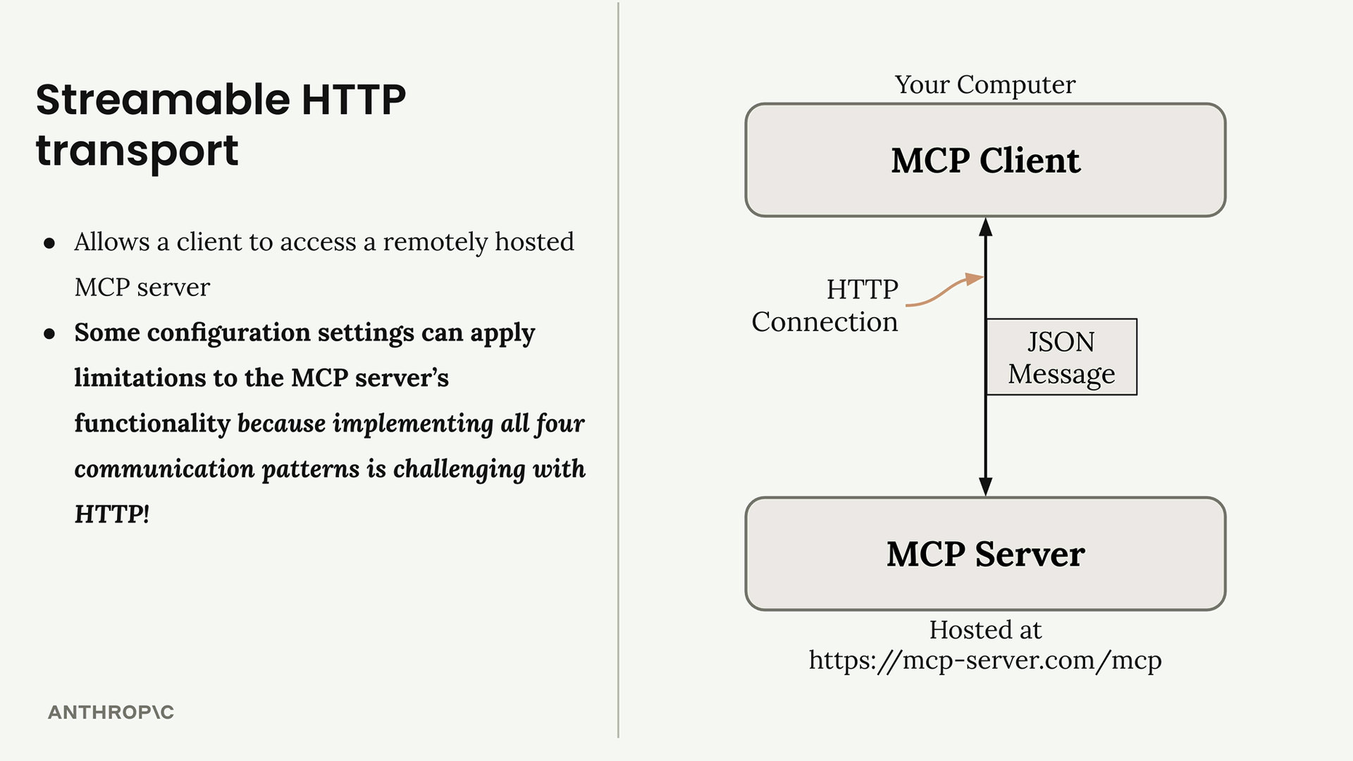 핵심은 이러한 제한이 존재한다는 사실을 인지하고 이에 맞게 MCP 서버 아키텍처를 계획하는 것입니다. 애플리케이션이 서버 시작 요청이나 실시간 알림에 크게 의존한다면, 전송 방식 선택을 재고하거나 대안적인 통신 패턴을 구현해야 할 수도 있습니다.